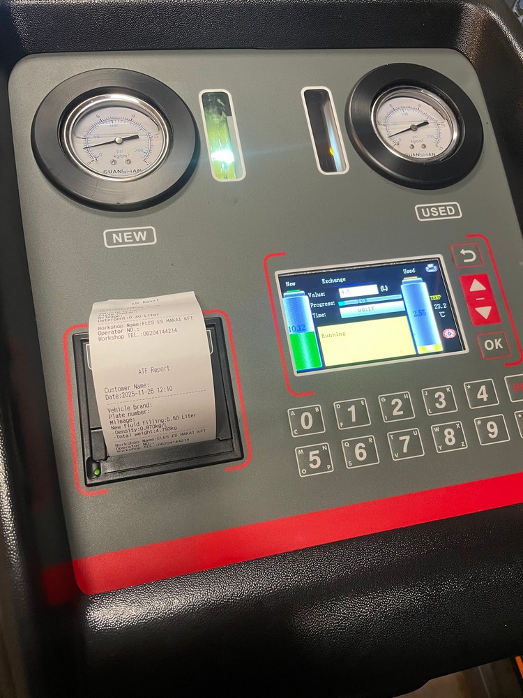 Végül a váltótisztító gép nyomtatott formában pontos leírást ad a felhasznált tisztítóadalék és ATF olaj mennyiségről, illetve a számítógépes diagnosztikáról nyomtatott formában is mérési jegyzőkönyvet és hibakód mentességet igazoló dokumentumot állítunk ki.